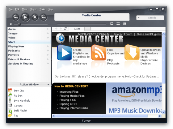J.River Media Center - мультимедийный центр. Проигрывает большинство популярных аудио и видео форматов, включая MP3, аудио CD и DVD, может преобразовывать CD-аудиотреки в WAV и MP3, переписывать на жесткий диск виниловые диски и кассеты, а также создавать аудио-CD, причем для всех этих функций программа имеет множество настраиваемых параметров. Кроме этого, есть очень хороший и мощный по своим возможностям органайзер мультимедийных файлов, медиаредактор, эквалайзер, встроенный DSP и удобный планировщик заданий для автоматизации процессов проигрывания/записи, а также поддержка пульта ДУ. Из необязательных, но приятных функций - становящаяся уже почти стандартом для "приличных" программ возможность изменения внешнего вида с помощью скинов, мини-режим проигрывателя и "телевизор".