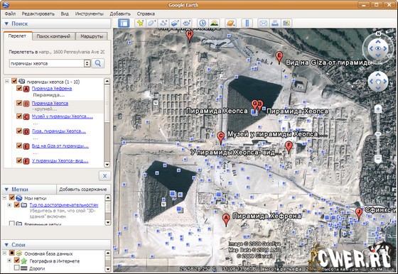 Google Earth - клиентское ПО для работы с трехмерной моделью Земли, созданной на основе спутниковых фотографий высокого разрешения. Широкие возможности по изменению масштаба изображений (иногда вплоть до отдельных домов), и многое другое, включая определение координат обьекта. Карту можно просматривать карту под любым углом; большая часть карты - это обычные 2D-фотографии, но некоторые объекты (населенные пункты) представлены в виде трехмерных моделей.