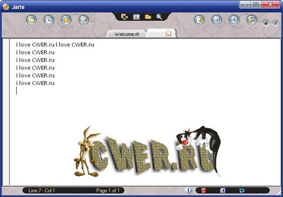 Jarte - это текстовый редактор с необычным интерфейсом. Программа обладает всеми основными функциями присущими программам подобного типа. Все новые документы в Jarte открываются во вкладках основного окна программы, что позволяет получать к ним быстрый доступ. Имеются удобные функции копирования и вставки текста с помощью колеса прокрутки мыши.