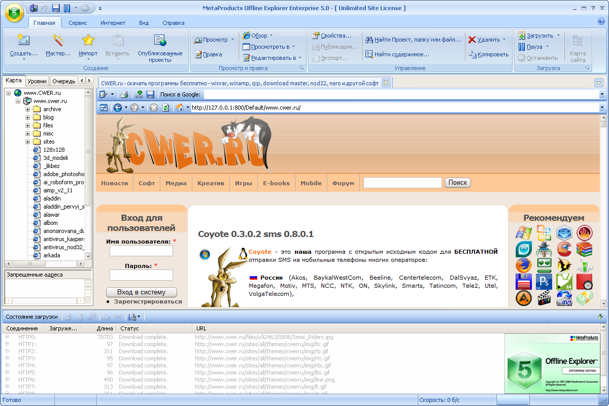 Offline Explorer Enterprise - Мощнейшая программа, позволяющая скачивать как отдельные файлы, так и целые веб-сайты (HTTP, FTP и HTTPS) на жесткий диск для их последующего офф-лайн просмотра как на отдельном компьютере, так и пользователями локальной сети - в программу встроен внутренний HTTP-сервер.