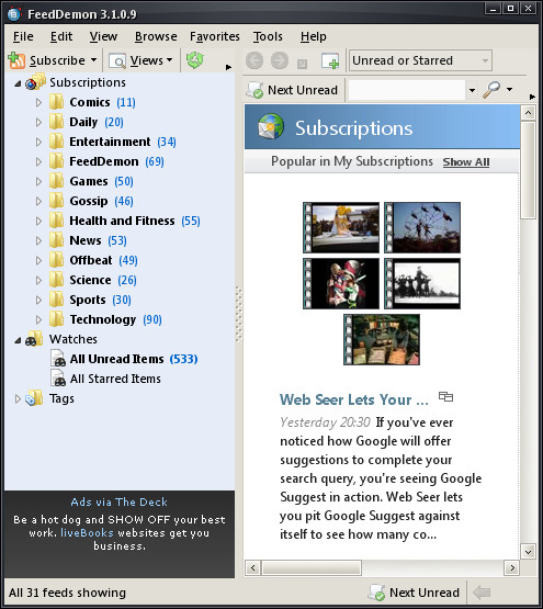 Вышла новая версия FeedDemon - одна из самых популярных программ для получения новостей с сайтов по технологии RSS и XML. По сравнению с обычным просмотром сайтов с помощью браузера, технология RSS имеет два существенных плюса - возможность практически полной автоматизации и значительное уменьшение обьема скачиваемых данных за счет отсутствия в получаемых новостях рекламы (нет ни баннеров, ни чего-либо еще).