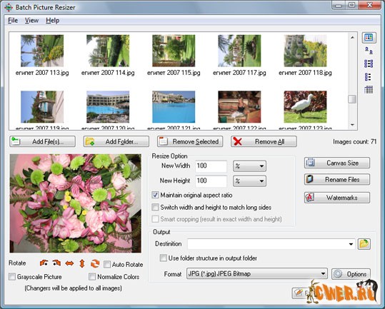 Batch Picture Resizer - программа для изменения размеров изображений, преобразования форматов, пакетной обработки фото, переименования файлов и добавления водяных знаков. Batch Picture Resizer работает с форматами JPG, BMP, TIFF, GIF, PNG, PCX, TGA и др. Утилита может не только изменить размеры фотографий, сохраняя высокое качество и применяя различные алгоритмы интерполяции, но и повернуть или зеркально отразить изображения без потерь качества. Batch Picture Resizer позволяет одним кликом мыши оптимизировать контраст, яркость и цветовые уровни, преобразовать изображения в черно-белый формат, добавить водяные знаки.