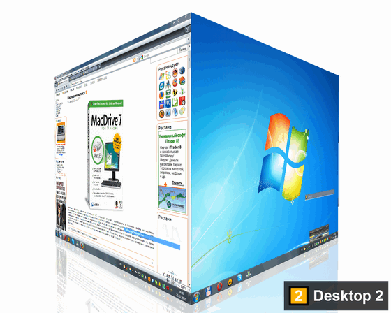 DeskSpace - программа для создания нескольких виртуальных рабочих столов, ранее логическое продолжение бесплатной Yod'm 3D. С помощью DeskSpace пользователь может создать шесть рабочих столов, каждый из которых представляет собой грань виртуального куба, вращая который можно переключаться между рабочими столами. В настоящее время программа серьезно улучшена. Она поддерживает работу с несколькими мониторами, причем для каждого монитора можно создать отдельный виртуальный куб. DeskSpace поддерживает работу с горячими клавишами, понимает жесты мышью, а непрозрачность куба регулируется.
