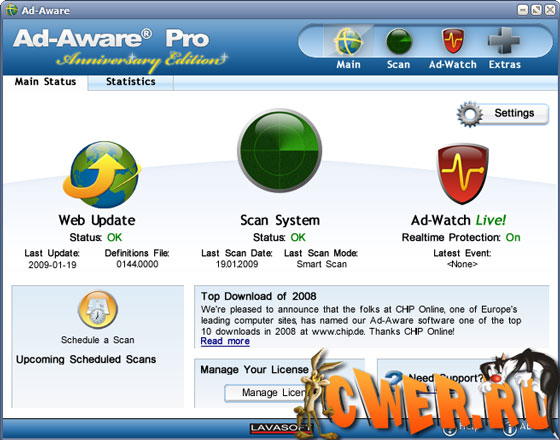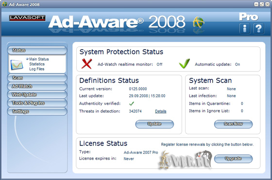 Ad-Aware 2008 Pro предназначена для поиска и устранения шпионских модулей. При своей работе Ad-Aware сканирует оперативную память, файлы на жёстком диске и определяет в них программы-шпионы и запущенные вредоносные процессы. Также сканируется реестр операционной системы. Если в реестре обнаруживается запись, установленная вредоносной программой, то она удаляется. Работает Ad-Aware достаточно шустро, настройки просты и интуитивно понятны. Если обнаруживаются шпионские модули, то программа предлагает удалить их все или выборочно. Для предотвращения случайного удаления нужного файла или записи в реестре предусмотрена функция восстановления (для этого автоматически создаются backup-копии удаляемых данных). Данная программа (или аналог) должна быть у каждого пользователя, который работает на компьютере в Интернете. Проверять и удалять из системы шпионов просто необходимо.