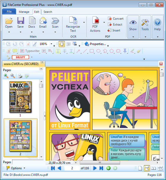 FileCenter — легкая в использовании программа для сканирования, архивирования, организации и поиска файлов на компьютере. Эта программа объединяет в едином интерфейсе большую функциональность для управления файлами, сканирования, OCR-распознавания, конвертирования файлов в PDF документы и их просмотра во встроенном просмотрщике PDF файлов. С помощью этой программы вы сможете организовать файлы в «файловые кабинеты», делать предпросмотр файлов без необходимости в их открытии, проделывать полнотекстовый поиск на рабочем и сетевых компьютерах, шифровать или полностью уничтожать любые файлы, отправлять файлы по электронной почте в качестве PDF, архивировать почту Outlook в отдельный файл и многое другое.