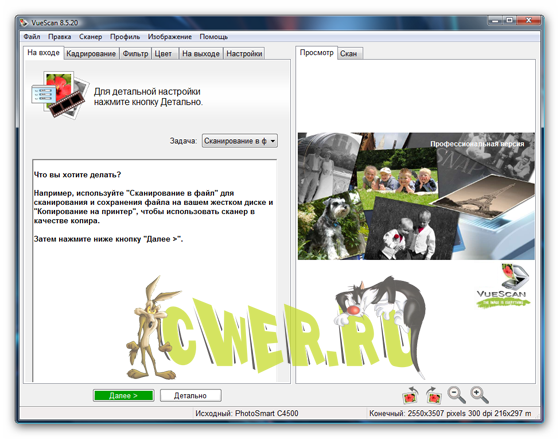 VueScan Pro - программа для работы со сканерами HP, Minolta, Nikon, Polaroid, Epson, Canon и другими. Может работать с внутренней глубиной цвета. VueScan поддерживает автоматическую и ручную настройку большинства параметров и пакетный режим сканирования. Поддерживается более 500 моделей сканеров с определенным перевесом в сторону слайд-сканеров — Nikon, Minolta, Polaroid, Microtek, Epson. Предусмотрено автоматическое удаление дефектов изображения за счет канала инфракрасного сканирования и многопроходное сканирование с последующим усреднением результата — для подавления собственных шумов сканера. Имеются фильтры подавления зерна, нерезкого маскирования и удаления паразитного оттенка оригинала. Есть средства ручной корректировки динамического диапазона и градационной характеристики (независимо по каналам R, G, B).