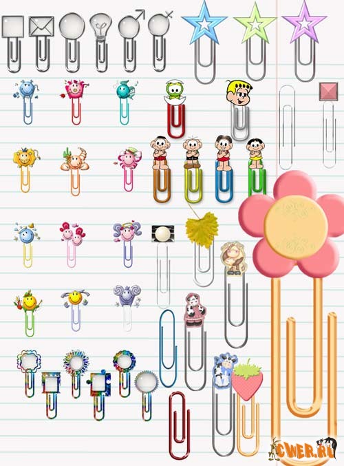 Канцелярские скрепки в формате PNG для оформления школьных рамочек и коллажей. Прозрачный фон.