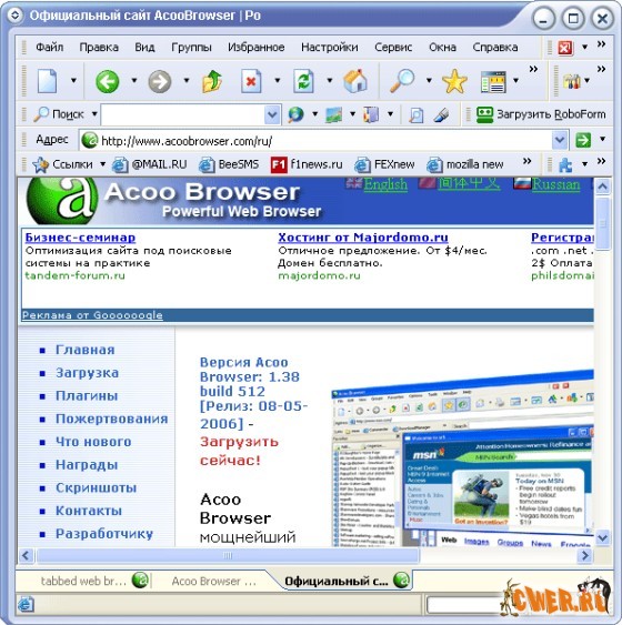 Обновился Acoo Browser - многовкладочный браузер на ядре Internet Explorer с расширенными возможностями. Жесты мыши, URL-алиасы, подсветка синтаксиса при просмотре кода страницы, анализатор страниц, блокировщик всплывающих окон, фильтр рекламы и другие полезные функциональности (большая часть из которых, правда, есть и в IE 7)...