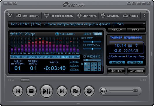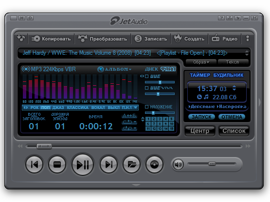 JetAudio — это универсальный проигрыватель музыкальных и видео файлов, риппер, конвертер и т.д., в общем, все в одном комплекте. Программа поддерживает практически все музыкальный форматы, умеет проигрывать MP3, MP2, WAV, MID, REAL AUDIO/VIDEO, S3M, MOD, MPG, AVI, MOV, Video/Audio CD, RealPlayer G2 и некоторые другие форматы мультимедийных файлов. Позволяет записывать аудио компакт-диски или копировать их содержимое на жесткий диск ПК. Есть возможность накладывать на композиции различные эффекты, поддерживается синхронизация для караоке, имеется эквалайзер, конвертер форматов, редактор тэгов, кроссфейдинг, субтитры и т.д.