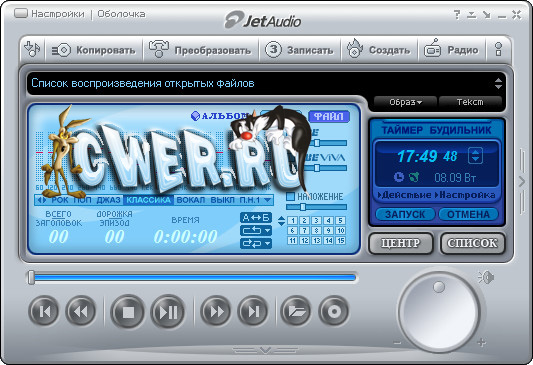 jetAudio - популярный бесплатный проигрыватель мультимедиа файлов. Программа поддерживает огромное число форматов, среди которых: WAV, MP3, MP3Pro, OGG, WMA, MPG, AVI, WMV, MIDI, RM и другие. При помощи этой программы можно не только слушать и смотреть медиафайлы, а также накладывать звуковые эффекты, изменять скорость просмотра видео, оцифровывать аудио диски, преобразовывать файлы из одного формата в другой и многое другое. Разработкой данной программы занимается компания COWON известная в первую очередь своими аудио-плеерами (материальными). Такой функциональности, как у бесплатной версии плеера jetAudio подчас не бывает и у платных проигрывателей. Кроме всех своих функций, данный плеер обладает очень симпатичным и удобным интерфейсом, а также поддерживает работу с субтитрами и Flash-плеерами.