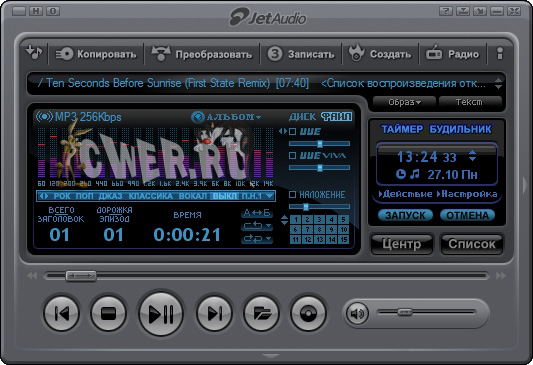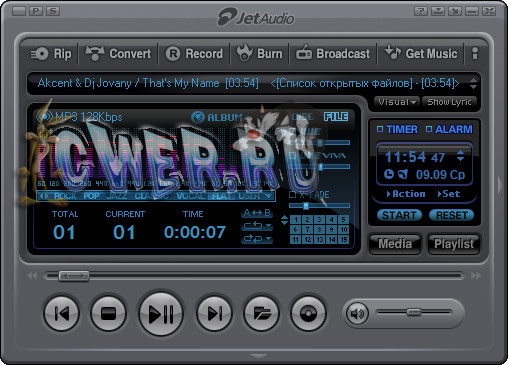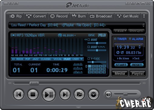 jetAudio - популярный проигрыватель мультимедиа файлов. Программа поддерживает огромное число форматов, среди которых: WAV, MP3, MP3Pro, OGG, WMA, MPG, AVI, WMV, MIDI, RM и другие. При помощи этой программы можно не только слушать и смотреть медиафайлы, а также накладывать звуковые эффекты, изменять скорость просмотра видео, оцифровывать аудио диски, преобразовывать файлы из одного формата в другой и многое другое. Разработкой данной программы занимается компания COWON известная в первую очередь своими аудио-плеерами (материальными). Такой функциональности, как у бесплатной версии плеера jetAudio подчас не бывает и у платных проигрывателей. Кроме всех своих функций, данный плеер обладает очень симпатичным и удобным интерфейсом, а также поддерживает работу с субтитрами и Flash-плеерами.