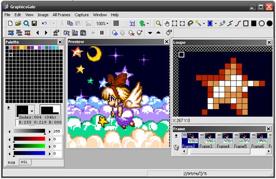 GraphicsGale - небольшой редактор растровых изображений с хорошим набором инструментов для рисования мелкой по размеру графики, например, иконки. С помощью данной программы вы сможете ретушировать фотографии, рисовать картинки и многое другое. В отличие от множества графических редакторов, данная программа позволяет создавать анимированные изображения с предпросмотром результата в отдельном окне. Программа отлично подойдет для рисования и редактирования иконок в форматах ICO, курсоров, анимированных GIF изображений и многого другого. Также данная программа имеет поддержку открытия AVI файлов (без звука). Как и большинство графических редакторов, программа работает со слоями, имеет собственный модуль для просмотра изображений, а также позволяет обрабатывать изображения в пакетном режиме. Интерфейс программы очень прост и легок в использовании.