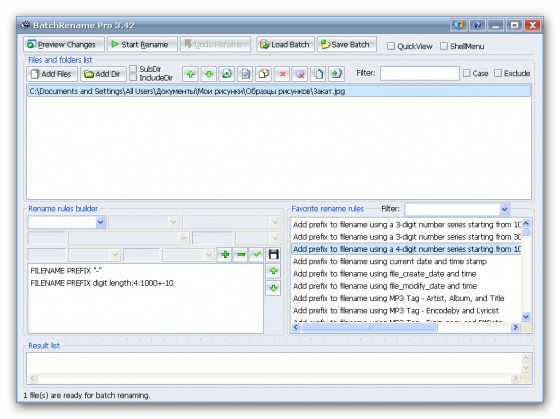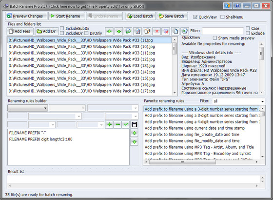 BatchRename Pro – программа для пакетного переименования файлов и папок. BatchRename Pro может переименовывать файлы, используя EXIF-мета-данные фотографий, ID3-тэги музыкальных файлов, параметры изображений (разрешение, количество цветов, дата, формат и т.д.), а также другие атрибуты.