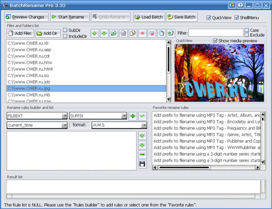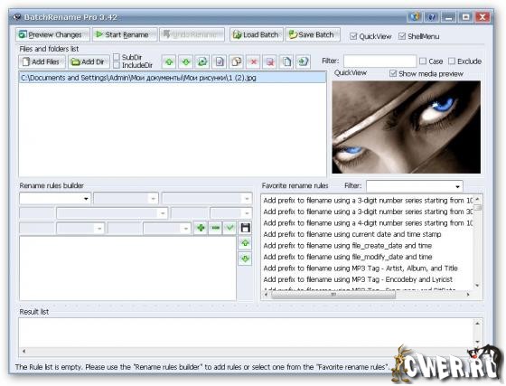 BatchRename Pro - программа для переименования большого количества файлов. Позволяет создавать правила, с помощью которых вы можете указать параметры, по которым будет происходить процесс переименования файлов. Кроме этого, программа позволяет отменять процесс переименования и восстанавливать исходные имена файлов, а также вести логи всех действий и многое другое. Имеется возможность предпросмотра файлов, будь то изображение, музыка или фильм. Помимо этого, программа может в пакетном режиме изменять размеры, поворачивать или отражать изображения.