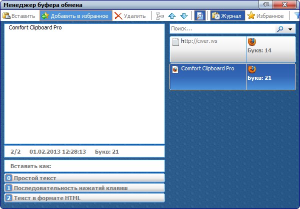 Comfort Clipboard - удобный менеджер буфера обмена. Поддерживает все известные форматы данных. Ведет историю буфера обмена с функцией повторной вставки любого выбранного фрагмента. Дополнительные возможности: автоматическое сохранение фрагментов буфера обмена на жесткий диск, вставка фрагмента в любом из доступных форматов, функциональное окно предварительного просмотра сохраненных фрагментов, демонстрация дополнительной информации по фрагментам.