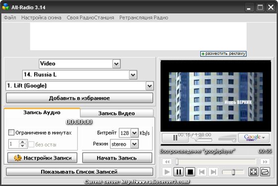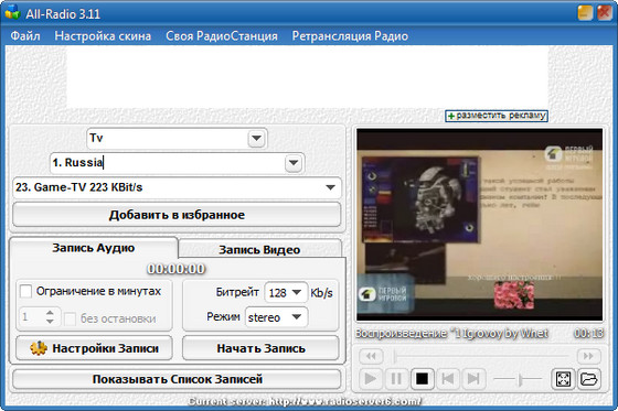 Программа для прослушивания радиостанций и просмотра ТВ-каналов, вещающих через интернет с возможностью записи аудио и видео потока. После установки All-Radio у вас появится доступ к 2500 радиостанциям и 1200 телевизионным каналам со всех уголков планеты (более 100 стран). В программе собраны практически все РАДИО и ТВ станции, вещающие на русском языке. Положительным моментов является то, что вам не надо обновлять программу в целях пополнения списка станций. При запуске последние списки автоматически загружаются с сервера разработчиков.