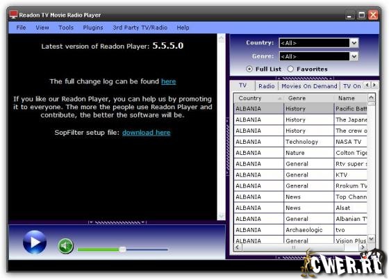 Readon TV Movie Radio Player 5.5.0.0 представляет собой программу, с помощью которой Вы сможете просматривать тысячи различных каналов Интернет-телевидения и Интернет-радио. Понравившиеся музыкальные композиции можно сохранить в формате mp3. Программа имеет удобный интерфейс: все каналы разбиты по странам (есть несколько десятков на русском языке) и категориям. Readon TV Movie Radio Player 5.5.0.0 - это действительно лучший программный продукт в своей области.