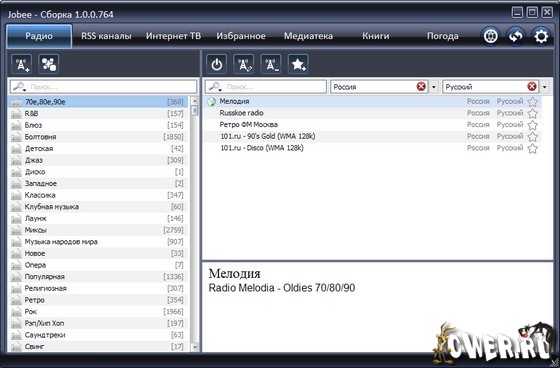 Jobee – это удобный плеер, предназначенный для комфортного прослушивания интернет радиостанций и аудио-подкастов, просмотра интернет-телевидения, чтения RSS-лент. Программа запомнит до какого момента вы прослушали аудио-подкаст или какую последнюю радиостанцию вы слушали. Он сам скачает Вам обновления в RSS-лентах и сообщит об этом нотификатором в правом нижнем углу экрана.