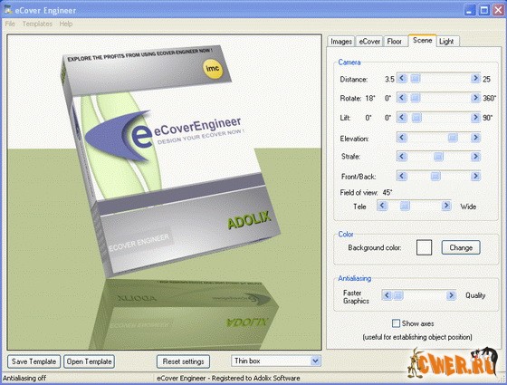 eCover Engineer – программа для создания и редактирования виртуальных трехмерных графических оболочек для Ваших продуктов. Первые впечатления очень важны для потенциального клиента, и первое что он может увидеть, - это упаковку интересующего его продукта. Для большинства это решающий момент, - остановится или пойти дальше. Имея красивую красочную и привлекательную коробку, вы на 50% уже заинтересовали вашего клиента в его выборе. Профессиональный софт для подобных целей стоит достаточно дорого, но eCover Engineer поможет вам в этом. Создавайте ошеломляющие виртуальные обложки для ваших книг, бокс-коробки для программ, обложки CD и DVD. Используйте гибкие настройки и различные вариации, предлагаемые eCover Engineer, и успех вам гарантирован!