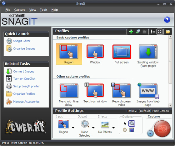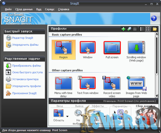 Основное назначение программы - снятие скриншотов с экрана монитора, причем SnagIt умеет делать не только статичные графические "снимки" выбранной области, но и, например, записать в видео то, что происходит на экране, а также захватить картинку из приложений, использующих Direct X, DirectDraw и Direct 3D.