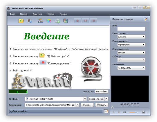 ImTOO MPEG Encoder - мощная утилита для конвертирования видео-файлов. Программа позволяет конвертировать файлы любых форматов, таких как AVI, MPEG, DivX, WMV, MP4, MOV, FLV, 3GP, PSP MPEG-4, iPod MPEG-4 и другие. Помимо этого программа может извлекать аудиодорожку из видео-файлов, конвертировать большинство популярных звуковых форматов, таких как MP3, WMA, WAV, AAC, M4A и другие. С помощью программы можно быстро и с высоким качеством конвертировать любой файл в мобильные форматы 3GP, FLV, PSP, Zune, iPod, iPhone, Apple TV для дальнейшего использования в портативных устройствах.