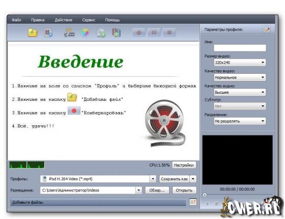 ImTOO 3GP Video Converter - новейшая версия популярнейшего конвертера, работающего с форматом 3GP, применяемом в большинстве сотовых телефонов. Жмет полуторачасовой фильм до 50 МВ! Поддерживается конвертация следующих форматов: AVI, MPEG, 3GP, GIF, WMV, H.264, WMA, WAV, MP3, MP4, M4A, OGG, AAC.