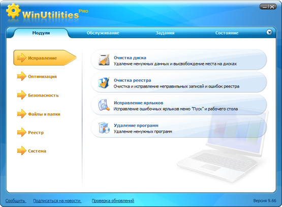 WinUtilities - набор утилит, предназначенных для настройки операционных систем семейства Windows. WinUtilities позволяет находить и удалять критические неисправности, неправильные ссылки и ключи в реестре, поможет правильно удалить приложения и программы, а также очистит историю интернета, cookies и многое другое. Также в программе есть возможность настроить автозапуск программ и изменять скрытые опции ОС.