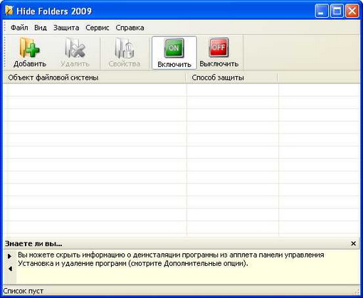Hide Folders 2009 - это удобный инструмент для сокрытия вашей конфиденциальной информации от посторонних. Программа позволяет скрывать целые папки на компьютерах под управлением Windows 2000/XP. Очень удобна и проста в использовании, достаточно просто перетащить скрываемую папку в окно программы и нажать всего одну кнопочку.