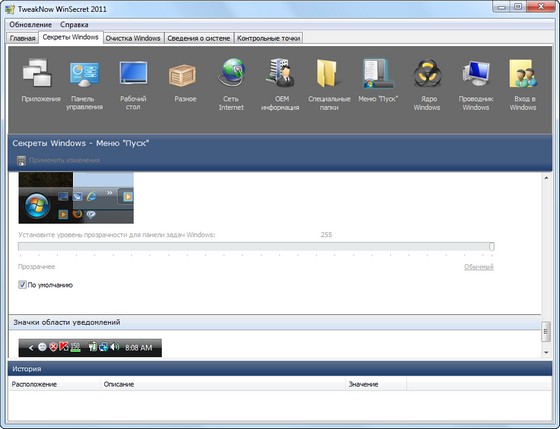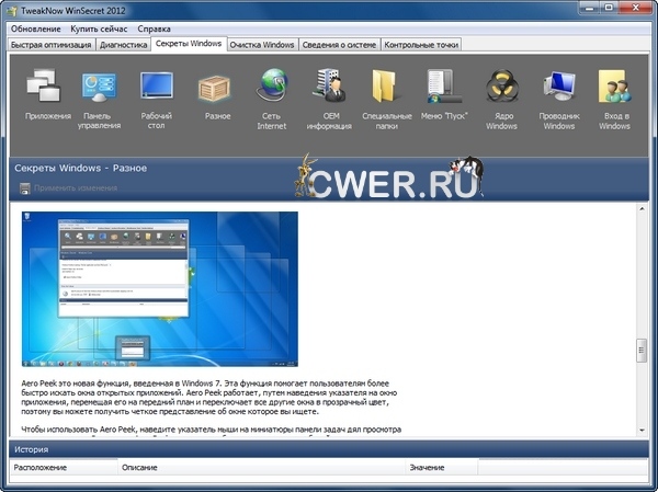 TweakNow WinSecret 2012 - программа для тонкой настройки Windows. Для удобства пользователя параметры разделены по категориям: приложения, панель управления, рабочий стол, сеть и Интернет, информация о компьютере, учетные записи пользователей, ядро Windows и т.д. Предусмотрен откат сделанных изменений.