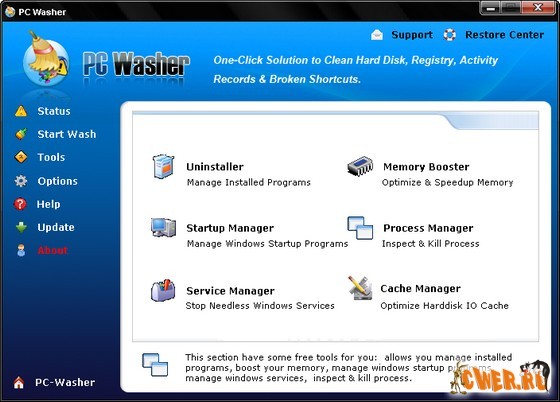 PC Washer - данная программа просканирует вашу систему и выдаст в процентном отношении её захламленность для принятия пользователем решения. Программе известно более 80 видов ненужных файлов, которые он готов удалить переместив их в корзину. PC Washer заставит вашу систему стать более устойчивой и работать быстрее, автоматически очищая ее от: временных интернет файлов и файлов оставленных программами; ненужных логов и файлов резервного копирования; пустых (нулевых) файлов; index.dat файлов; битых ярлыков; недействительных записей реестра и прочего ненужного мусора, так засоряющего вашу систему.