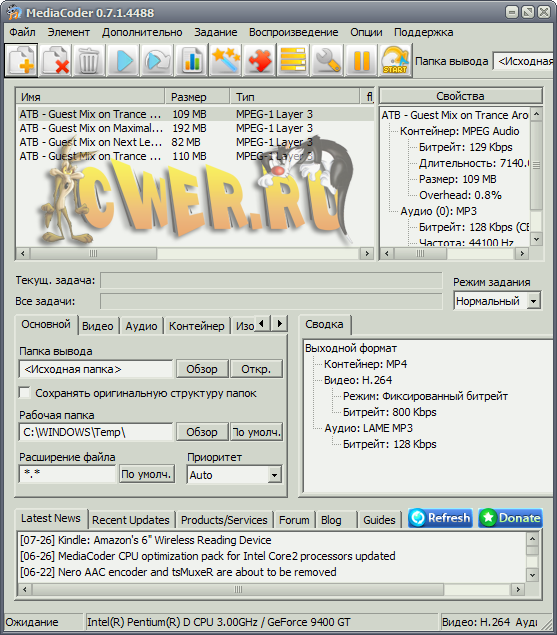 MediaCoder - позволяет повысить компрессию видео и аудио с целью уменьшения размеров файла, может извлекать аудиотреки, предоставляет возможности для конвертирования видео в нормальные VCD/DVD, может осуществлять конвертирование аудио без заметной потери качества, способен создавать копии CD "на лету" и многое другое.