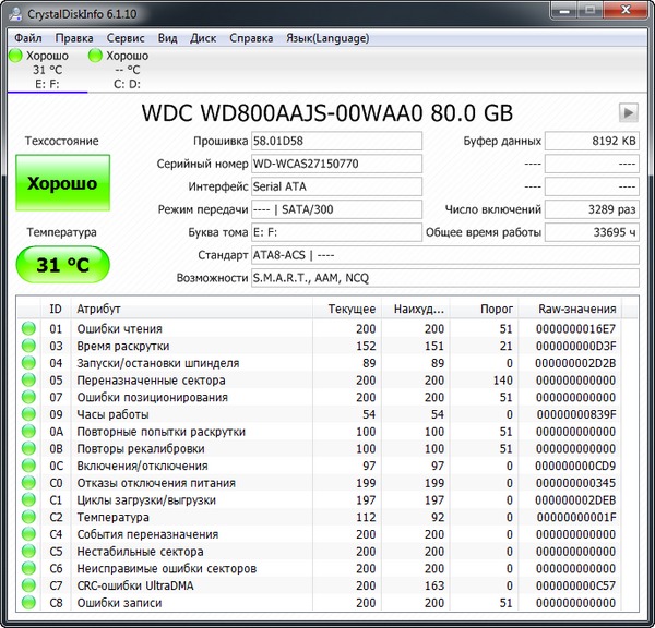 CrystalDiskInfo – следит за «здоровьем» жестких дисков, поддерживающих технологию самодиагностики S.M.A.R.T. Осуществляет мониторинг и дает общую оценку состояния вашего диска. Также выдаёт подробную информацию о жестких дисках, установленных в компьютере (прошивка, серийный номер, стандарт, интерфейс, общее время работы и др.) и выводит параметры атрибутов S.M.A.R.T. (ошибки чтения, производительность, запуски/остановки шпинделя, время поиска дорожки, количество циклов включения-выключения, ошибки секторов и многое другое). Может выводить в трее индикаторы с температурой каждого накопителя, строит график изменения температур. Позволяет управлять настройками производительность/шум.