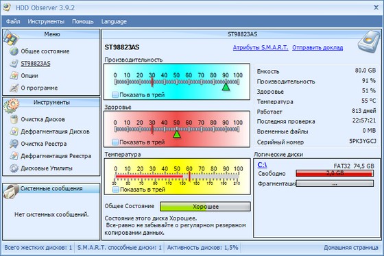 CrystalDiskInfo - отслеживает состояние жестких дисков, поддерживающих технологию S.M.A.R.T. Производит мониторинг и дает общую оценку "здоровья" вашего диска. Так же отображает детальную информацию о жестких дисках, установленных в компьютере (прошивка, серийный номер, стандарт, интерфейс, общее время работы и др.), а также выводит параметры атрибутов системы самодиагностики S.M.A.R.T. (ошибки чтения, производительность, запуски/остановки шпинделя, время поиска дорожки, количество циклов включения-выключения, ошибки секторов и многое другое).