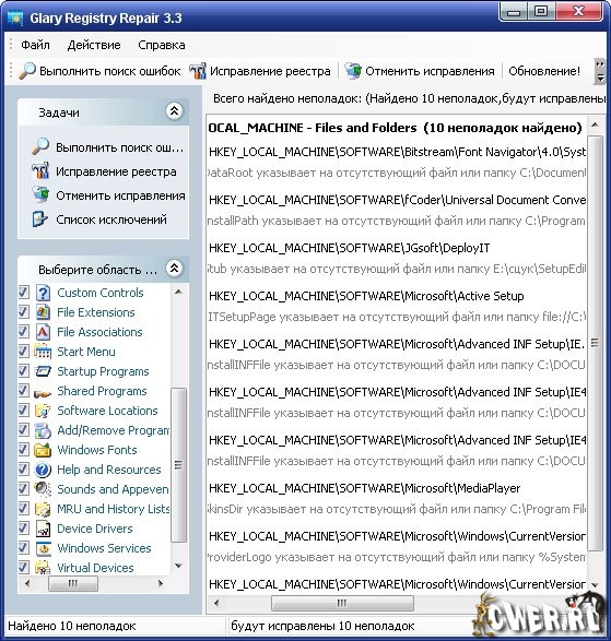 Registry Repair позволяет исправлять ошибки в реестре и оптимизировать работу PC. Всего несколькими простыми шагами, пользователь в состоянии найти проблемы вызванные недопустимыми включениями, неправильными ссылками в реестре Windows. Программа обеспечивает список найденных ошибок, пользователь может выборочно восстанавливать каждый элемент или автоматически восстановить их всех. Registry Repair использует высокоэффективный алгоритм обнаружения, чтобы быстро идентифицировать пропавшие и недопустимые ссылки в реестре Windows. Эти проблемы могут произойти по многим причинам, включая оставляемый после деинсталляционного или неправильного удаления программного обеспечения, отсутствия или порчи драйверов аппаратных средств, и т.п.