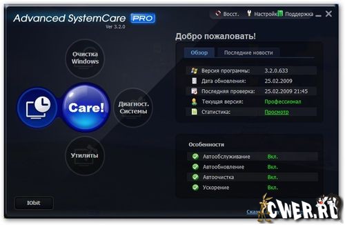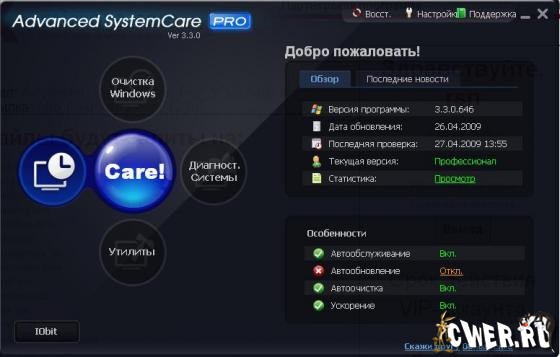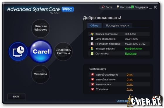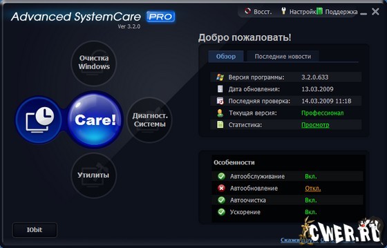Advanced SystemCare(ранее Advanced WindowsCare) - программа, которая включает в себя множество модулей для настройки, оптимизации и повышения производительности компьютеров, находящихся под управлением ОС Windows 2000/XP/Vista.
