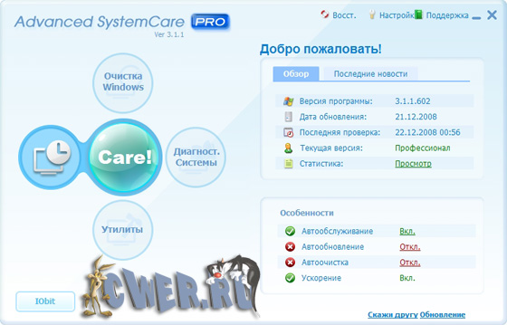 Advanced SystemCare (ранее Advanced WindowsCare)- программа, включающая в себя множество модулей для оптимизации, настройки и повышения производительности компьютеров, находящихся под управлением операционными системами Windows 2000/XP/Vista. Благодаря возможностям программы вы сможете очистить ПК от шпионского и рекламного ПО, обнаружить и заранее устранить возможные угрозы и бреши в системе безопасности ОС, исправить ошибки в системном реестре, очистить временные и ненужные файлы, управлять списками автозагрузок, оптимизировать работу систем.