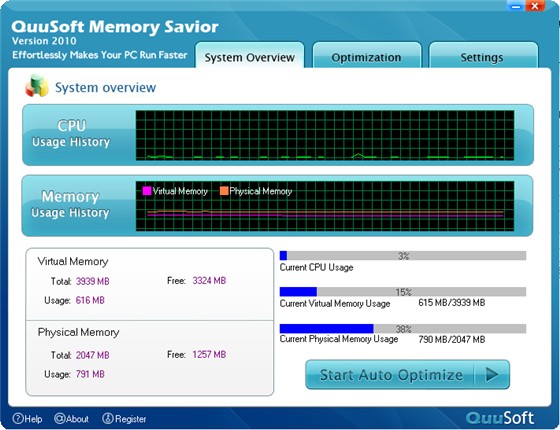 QuuSoft Memory Savior - программа предназначена для дефрагментации и сжатия физической оперативной памяти для оптимального ее использования. Позволяет уменьшать время загрузки и улучшать производительность приложений, запускаемых в вашей системе.