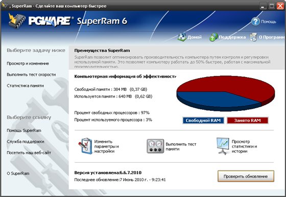 SuperRam - инструмент для оптимизации и управления компьютерной памятью. Работать с программой просто - с ней справится даже человек, никогда раньше не работавший с подобными утилитами. Вам будет достаточно выбрать объем памяти, который будет использоваться, и объем, который следует освободить, после чего нажать кнопку "ОК". Остальное сделает программа.