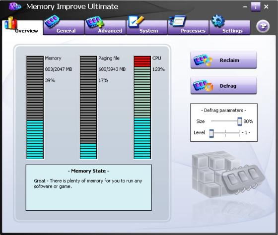 Memory Improve Master - позволяет увеличить быстродействие вашего компьютера за счет освобождения (дефрагментации) оперативной памяти. Имеется возможность установки минимального количества свободной оперативной памяти, при превышении которого запустится модуль и попытается удалить из оперативной памяти лишние процессы. Кроме этого, есть возможность просмотра запущенных процессов, наблюдение за нагрузкой на ЦП и множество других полезных настроек.