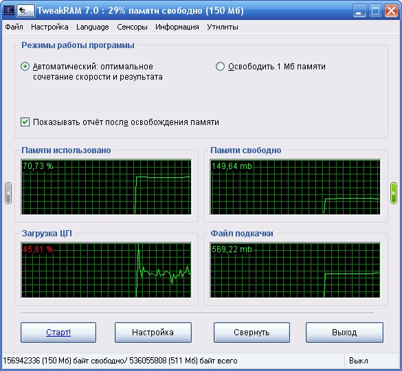 TweakRAM - это удобная программа для оптимизации памяти компьютера, с помощью которого ваш компьютер будет работать быстрее. Программа, дефрагментируя и освобождая оперативную память компьютера, увеличивает эффективность работы процессора и материнской платы, восстанавливает утечки памяти от некачественных приложений, убирает неиспользуемые библиотеки. В результате ее работы ваши любимые игры и приложения будут работать значительно быстрее даже на старых компьютерах.