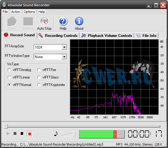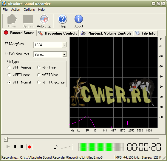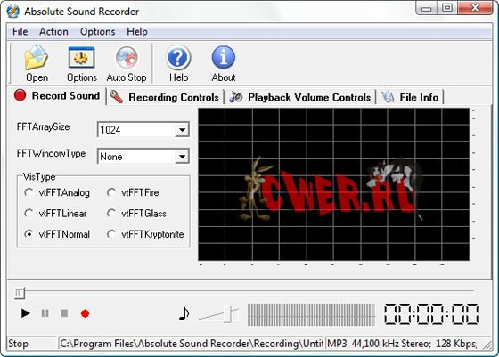 Absolute Sound Recorder - позволяет записать звук с любого источника: микрофон, линейный вход, аудио сигналы из Интернет, аудио/видео проигрывателя, игрушек и любой другой звуковой сигнал который поступает на звуковую карту. Записанный звук Absolute Sound Recorder может сохранить в большинстве распространенных аудио форматах, среди которых WAV, MP3, WMA и т.д.