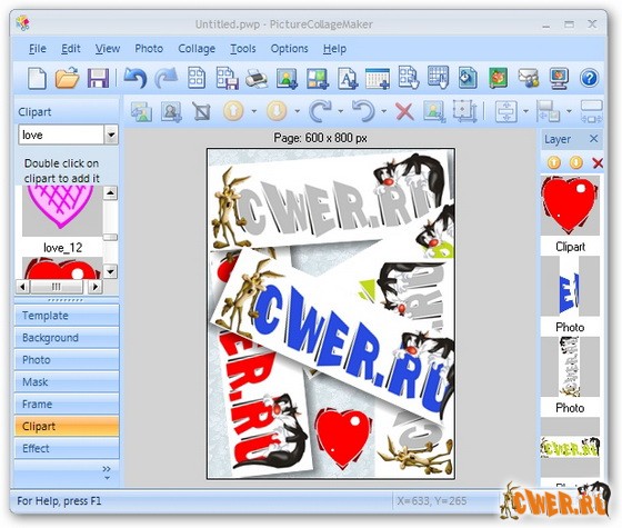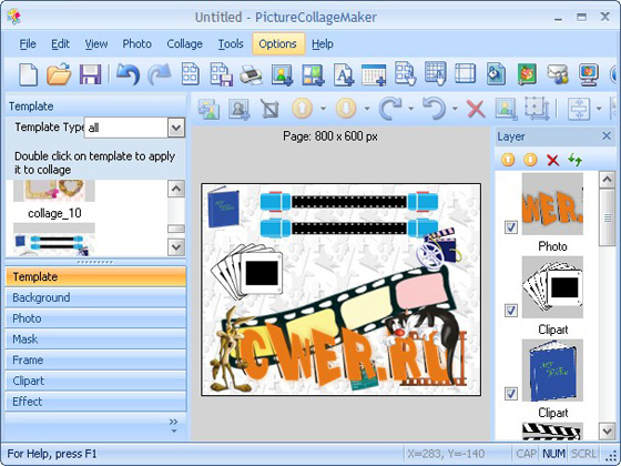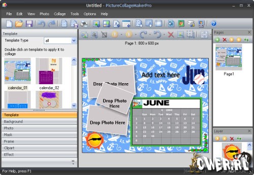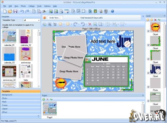 Picture Collage Maker - простая в использовании программа для создания коллажей из ваших фотографий. Простой интерфейс программы и множество шаблонов позволят легко создавать разнообразные фотоколлажи (календари, поздравительные открытки, пригласительные билеты, постеры и т.д.) даже неопытным пользователям. Создание коллажей - это расслабляющее время-провождение, помогающее превращать собранные фотографии в драгоценные воспоминания. Это самый легкий способ создания коллажей с применением вращений, изменения размеров, положений, обрамлений, маскировки, слияния и применением различных эффектов для каждой картинки по-отдельности. Результат может быть сохранен в форматах JPG, BMP, TIFF, GIF, WMF, TGA, PNG или установлен в качестве фонового рисунка для рабочего стола.