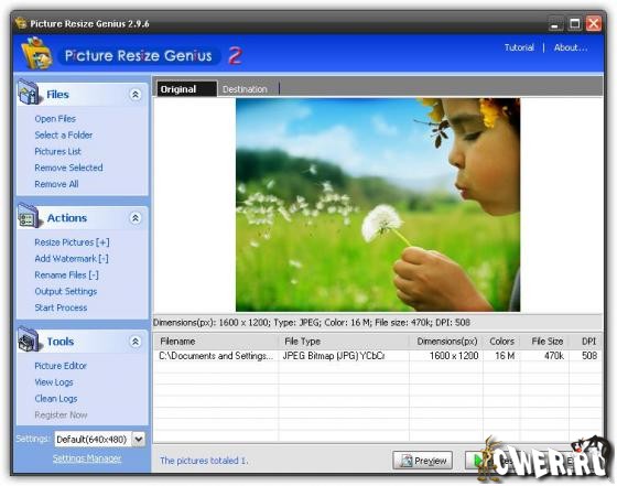 Picture Resize Genius дает возможность изменять размер целой группе рисунков, фотографий и изображений. Кроме этого можно наносить водяные знаки или логотип поверх изображения, переименовывать файл и многое другое. Вы сможете производить все эти действия над сотнями файлов одновременно, в течение нескольких секунд.