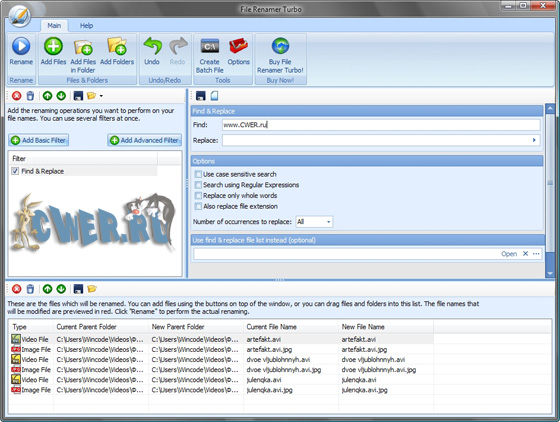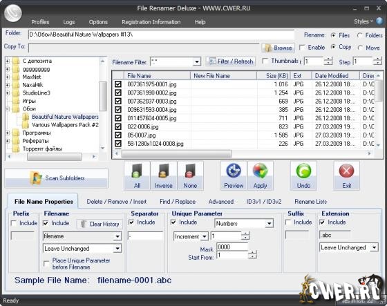 File Renamer Deluxe – программа для пакетного переименования файлов. Содержит множество фильтров, может переименовывать тысячи файлов в одной партии, изменять MP3-теги, автоматически создавать папки и распределять в них файлы, возможен предпросмотр графических файлов и многое другое.
