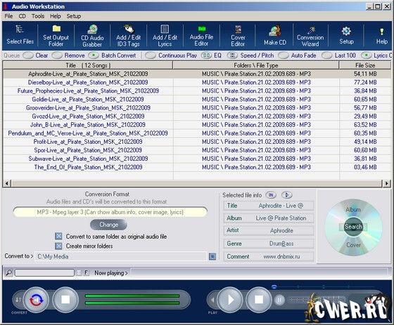 Audio Workstation - приложение из серии все в одном, позволяет производить граббинг CD Audio, редактировать аудио файлы (нормализация, усиление звука), редактировать ID3-теги и обложку альбома. Также программа позволяет копировать тексты из аудио файлов при конвертировании из WMA в MP3 формат. Присутствует 18 полосный эквалайзер для корректировки звучания аудио файлов и многое другое.
