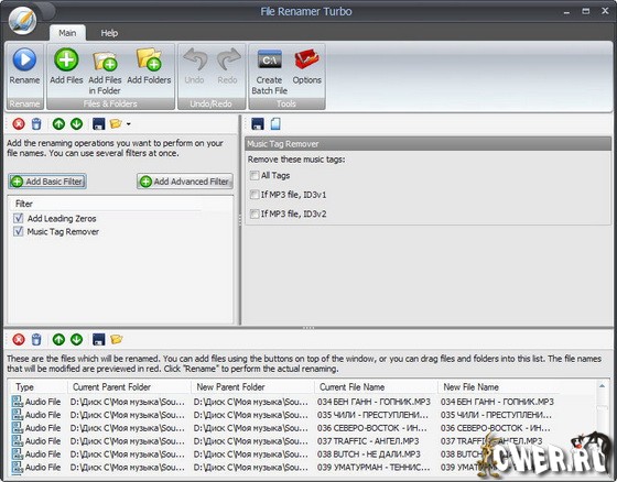 File Renamer Turbo - это новейший инструмент, который значительно облегчит вашу жизнь! Если вам нужно переименовать несколько файлов или заполнить ID3 тэги к MP3 файлам и музыкальные тэги к WMA, M4A, OGG, FLAC, APE или MPC файлам, эта программа сделают всю работу за пару минут. Kristanix File Renamer Turbo очень прост в использовании и обладает всей функциональностью, которая вам будет нужна. Дополнительные возможности программы: возможность перемещать файлы, поддержка regex, поддержка работы с командной строкой, поиск музыки в Интернете и расширение оболочки Windows по правому клику.
