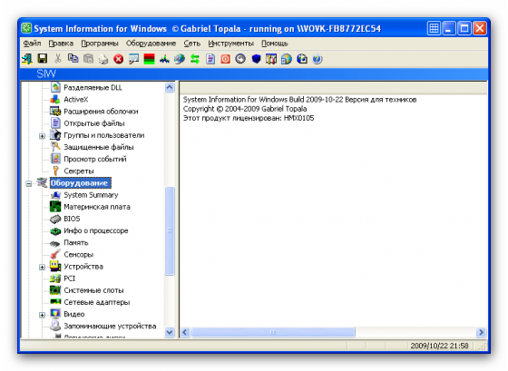 Компактная программа, выдающая подробные данные об аппаратных средствах компьютера, установленном на нем программном обеспечении, а также сетевую информацию. По своим возможностям SIW аналогичен популярной программе Everest, но, в отличие от нее, бесплатен (при некоммерческом использовании) и при этом содержит в себе несколько дополнительных утилит - для удаленного выключения\перезагрузки рабочей станции, взлома пароля Windows 9x, смены MAC-адреса сетевого устройства и некоторые другие. Интерфейс - многоязычный; работает на любой Windows-платформе, включая 64-битную.