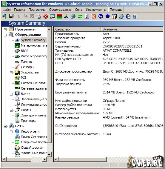 SIW (System Information for Windows) - программа для диагностики системы и анализа конфигурации компьютера. программа выдает подробную информацию о самых разных компонентах ПК, в том числе о материнской плате, чипсете, процессоре, BIOS, устройствах PCI/AGP, USB и ISA/PnP, оперативной памяти, видеокарте, мониторе, жестких дисках, принтерах и т.д.