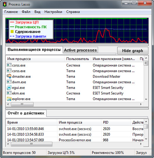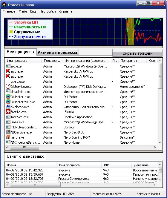 Process Lasso Pro - небольшая утилита, позволяющая вручную или автоматически манипулировать процессами, запущенными на вашем компьютере для достижения максимального быстродействия и стабильности. Эта утилита не является заменой стандартному менеджеру процессов, она, скорее, добавляет новые функции, которые позволяют оптимизировать работу ЦПУ при максимальной нагрузке. Программа дает возможность определить приоритет процессов, причем, по желанию пользователя приоритет будет задан и для всех последующих запусков. Также при помощи этой утилиты можно выполнить завершение работы нежелательных процессов. Кроме этого, программа позволяет вести статистику запущенных процессов. Программа имеет отдельную версию для 64-битных систем, а интерфейс программы обладает поддержкой русского языка.