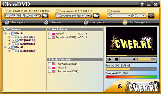 DVD X Studios CloneDVD предназначена для создания полностью идентичных копий DVD-фильмов и их записи на DVD-носители. Программа может полностью переписать содержимое диска, что позволяет создавать копии в режиме 1:1 (со всеми меню, субтитрами и т.д.). CloneDVD поддерживает работу с большинством существующих приводов, обладает хорошим быстродействием и качеством записи. Имеется русский интерфейс.